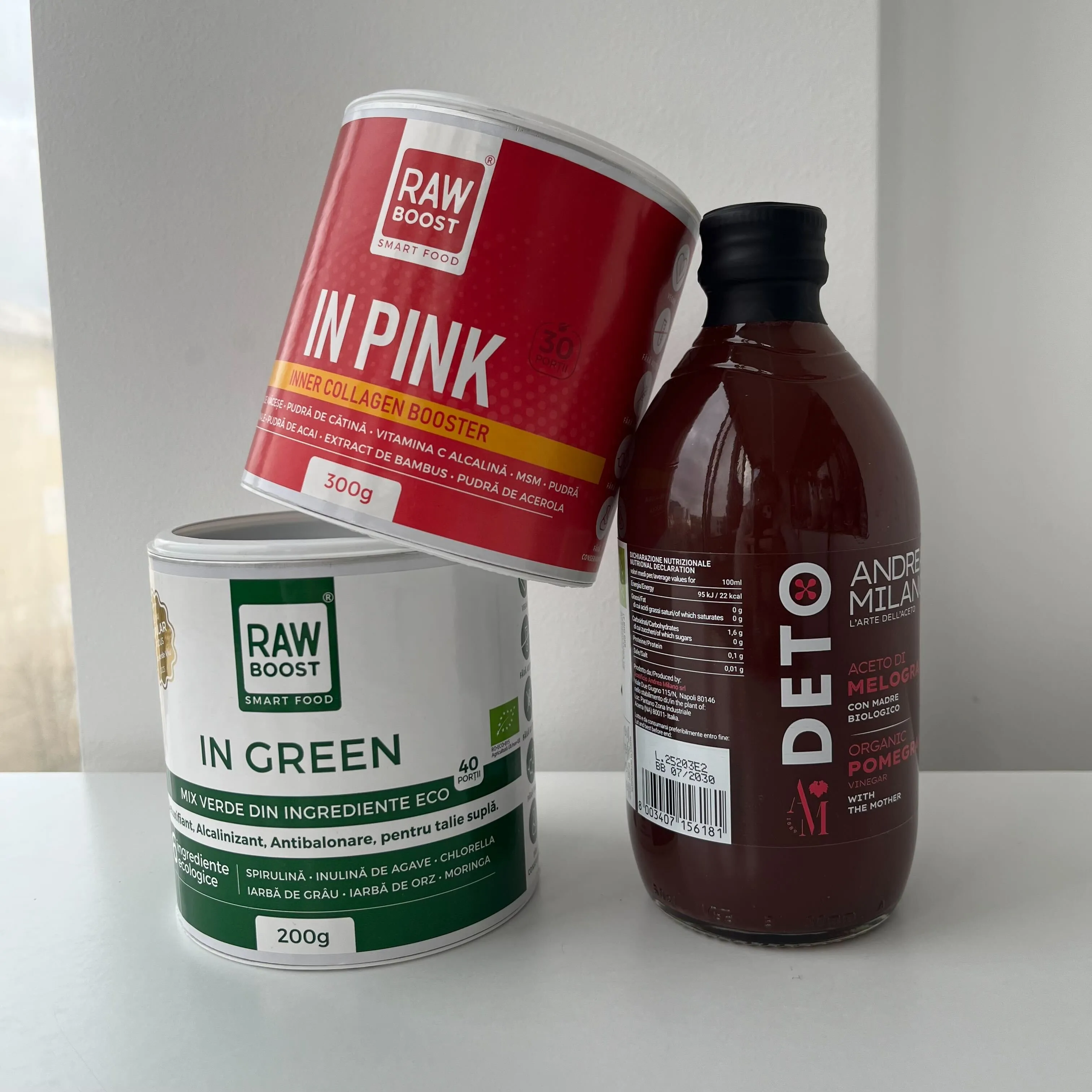 In Pink: Pudră de măceșe, pudră de cătină*, vitamina C alcalină, msm, pudră de curmale*, pudră de acai, extract de bambus (siliciu 70%), pudră de acerola*. *ingrediente de proveniență ecologică