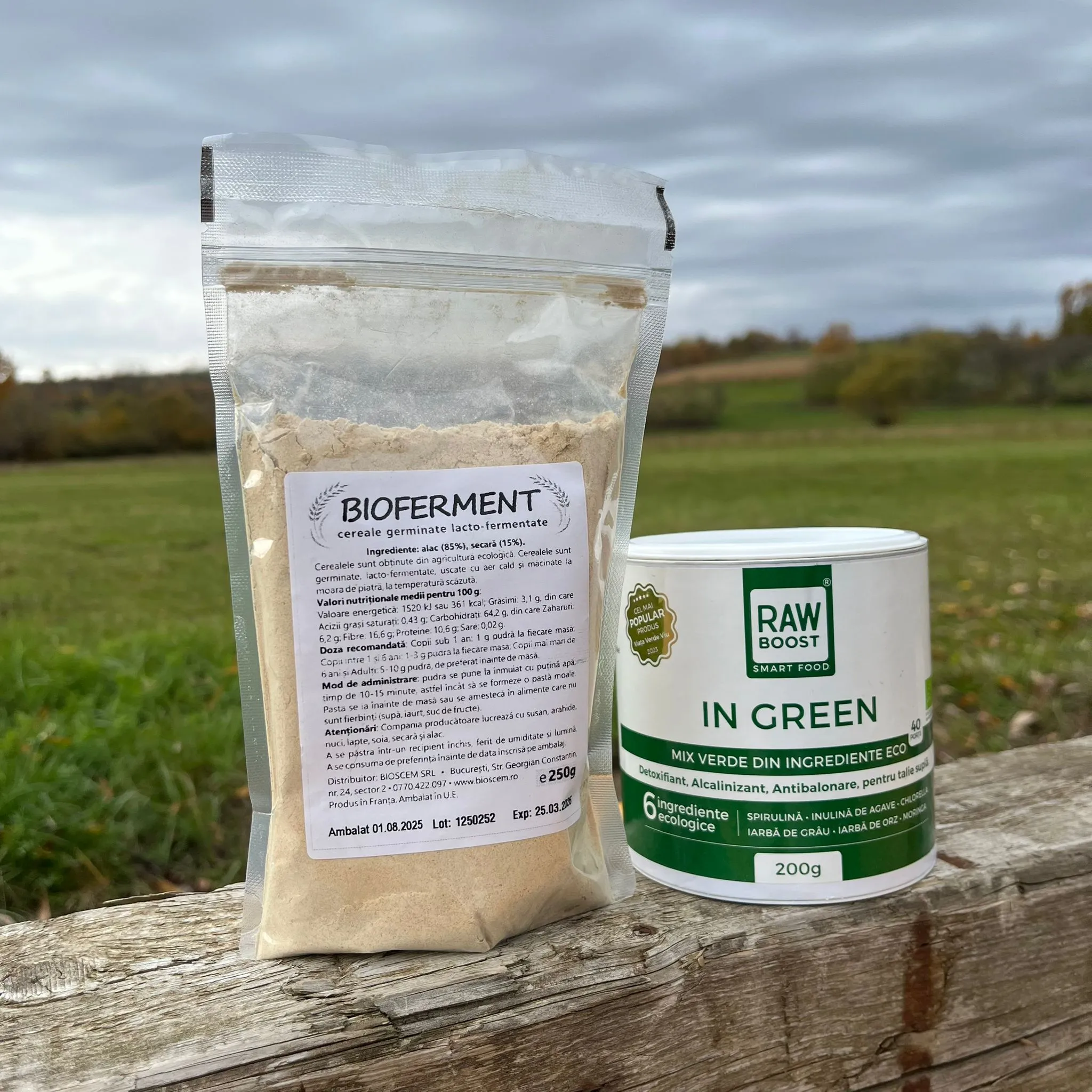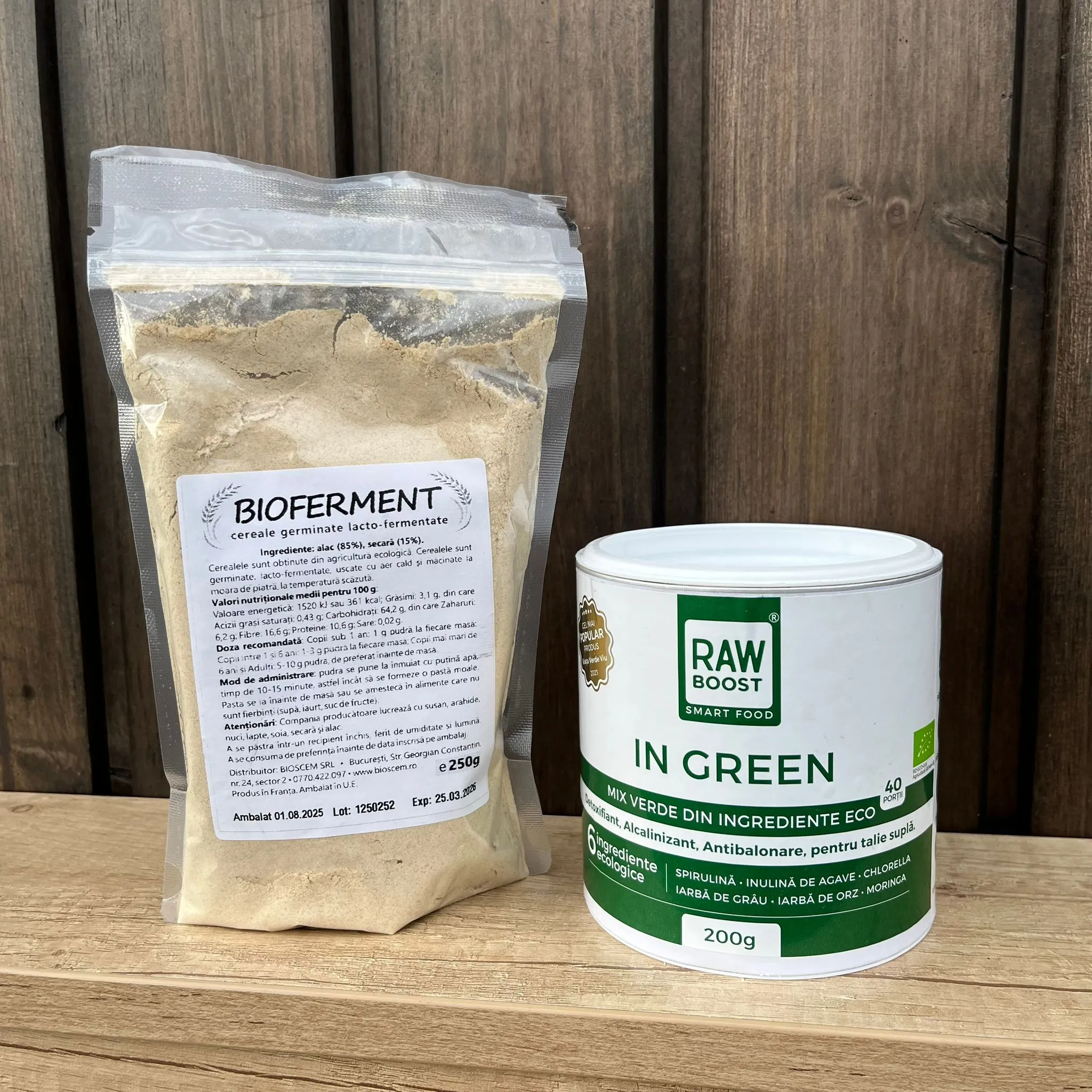 Combinația perfectă pentru un intestin sănătos: In Green pentru detox și digestie, Bioferment pentru echilibrul florei intestinale cu probiotice, prebiotice și enzime.