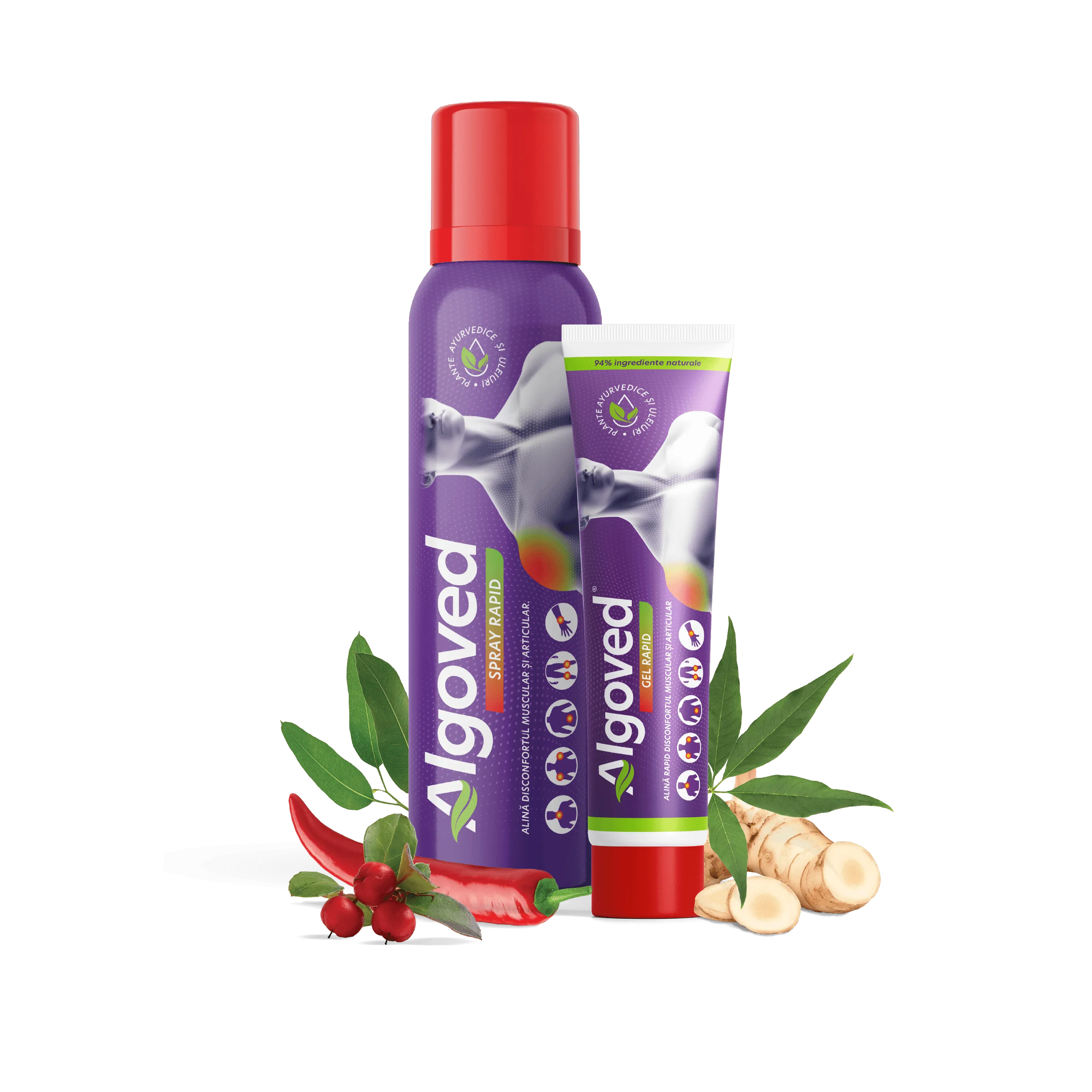 ALGOVED Spray Rapid și ALGOVED Gel Rapid conțin o formulă unică din plante medicinale ayurvedice și uleiuri esențiale, recunoscute pentru proprietățile lor calmante și antiinflamatoare naturale.