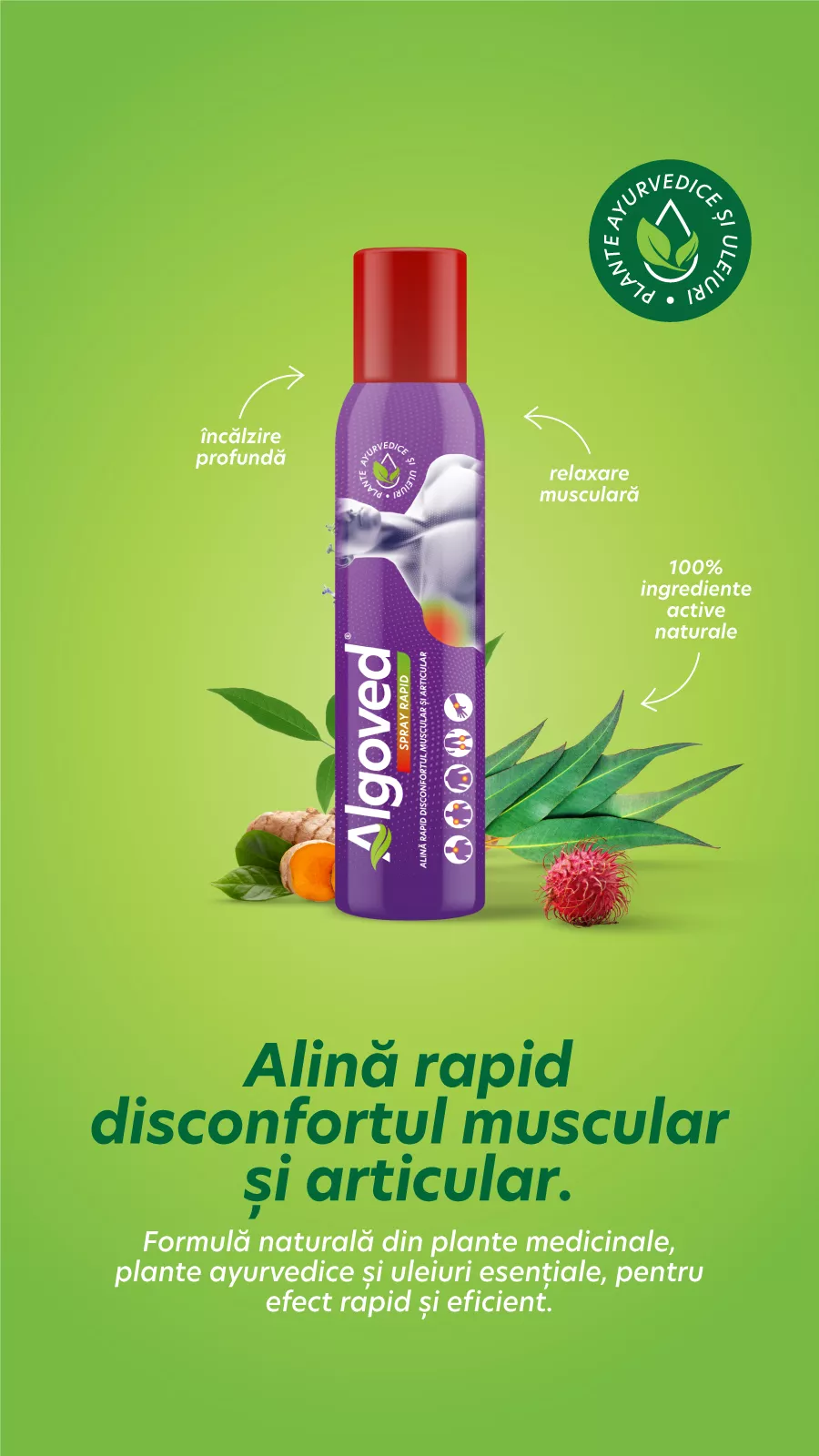 ALGOVED Spray Rapid 100g conține o formulă unică din plante medicinale ayurvedice, uleiuri esențiale și oleorășini naturale, cunoscute pentru proprietățile lor calmante și antiinflamatoare naturale.